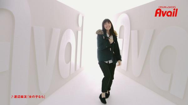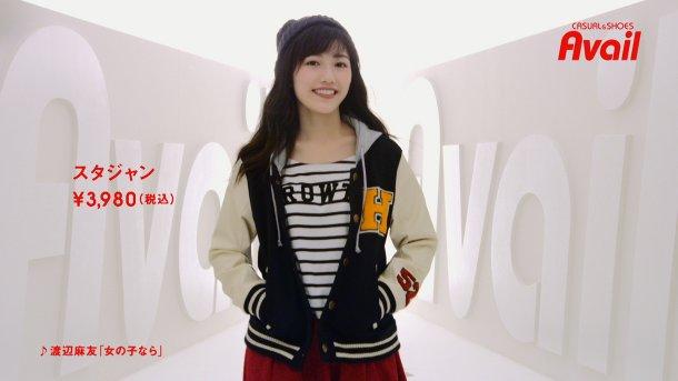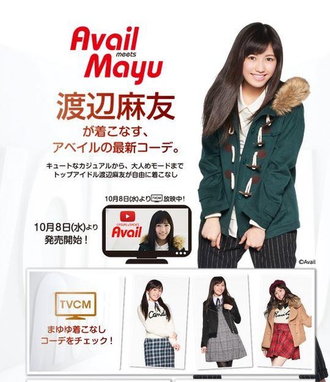 A:Avail 2014年10月より2014年11月現在まで、渡辺麻友がイメージキャラクターを務めるファッションブランド。 「Avail meets Mayu」をキャッチコピーに、8種のコーディネートをアピールした。 CM曲は渡辺麻友のソロ曲「女の子なら」。 [1]しまむら『Avail』2014 秋冬 渡辺麻友篇 2014.10
